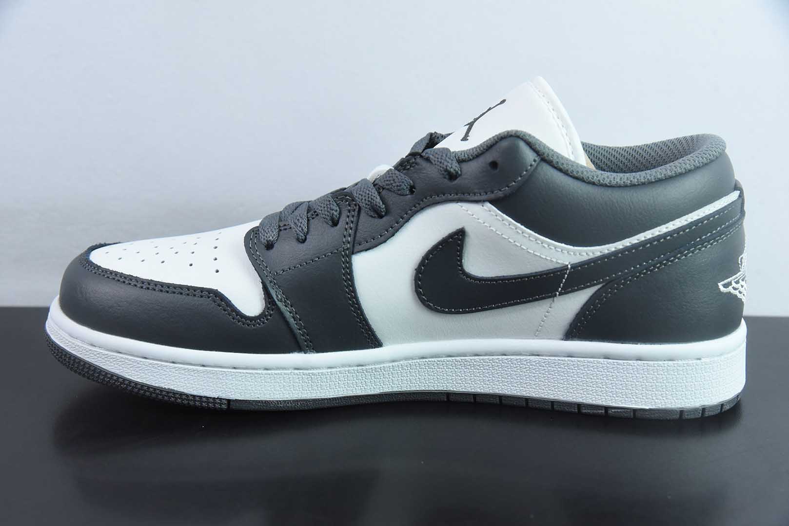 The Air Jordan 1 Low crafts its foundation in premium Light Smoke Grey and Sail leather, accented by a stark black Swoosh for iconic contrast. A grey suede toe box introduces textured depth against the smooth white upper, while the black Wings logo on the heel delivers the definitive finishing touch.
