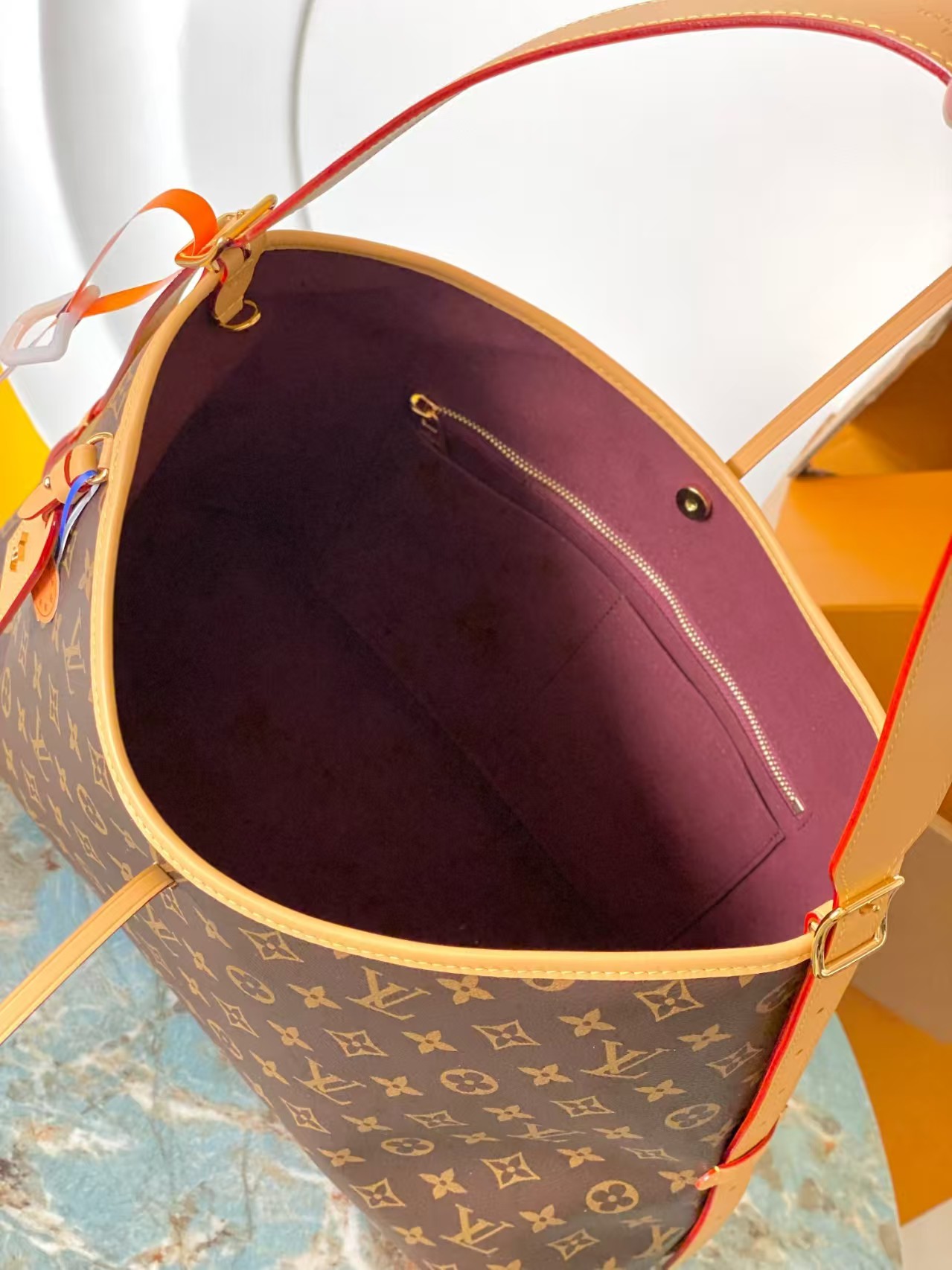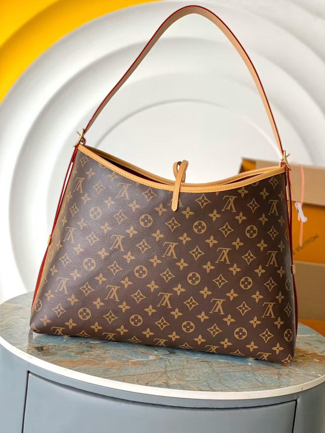 Louis Vuitton launches the CarryAll MM handbag in Monogram canvas with natural leather trim. Its contemporary, body-friendly design and roomy interior make this a fantastic everyday bag. Inside zipped pockets and a removable zipped pouch deliver even more functionality. A gold-color buckle allows the handle to be shortened or lengthened.