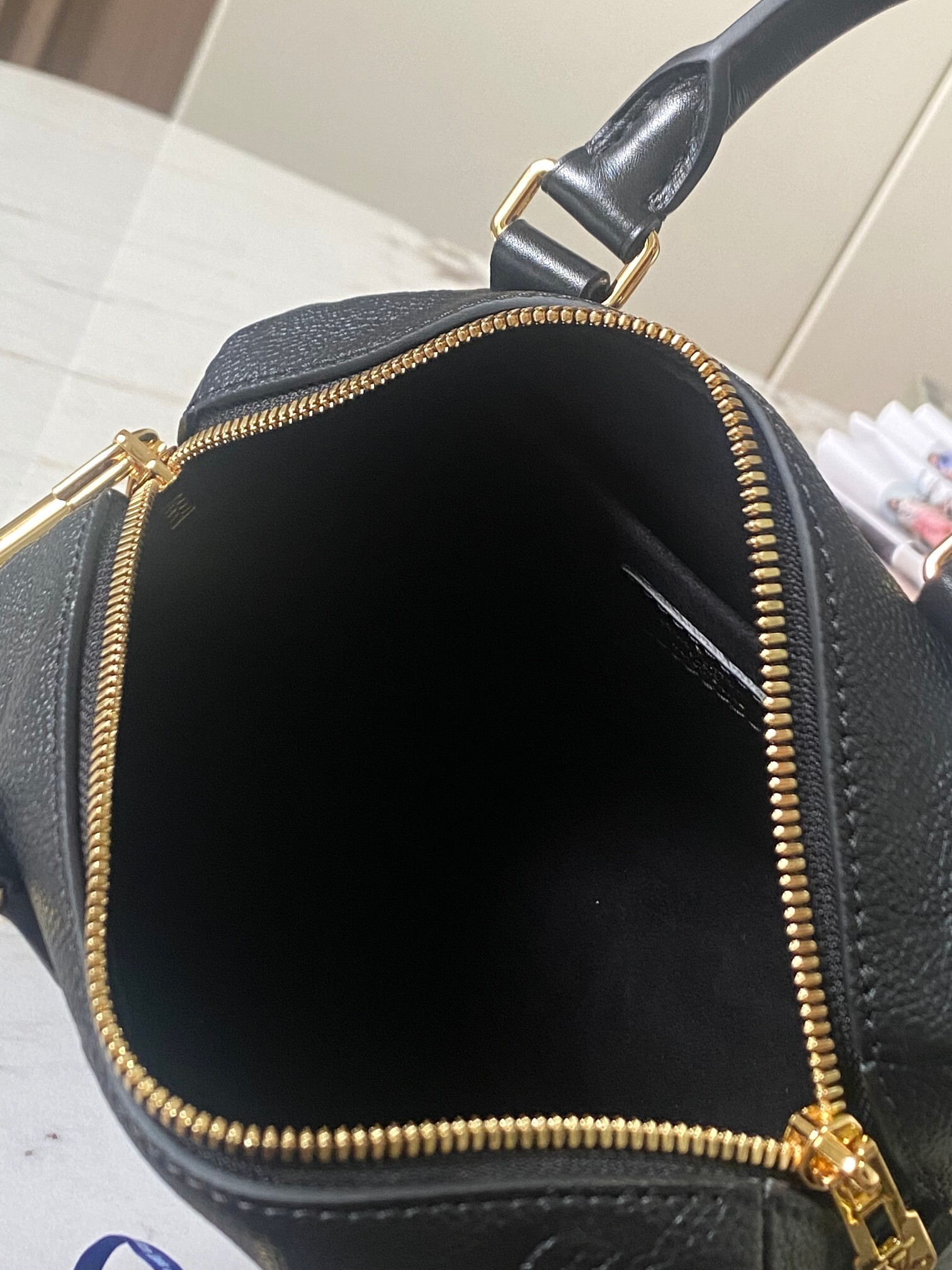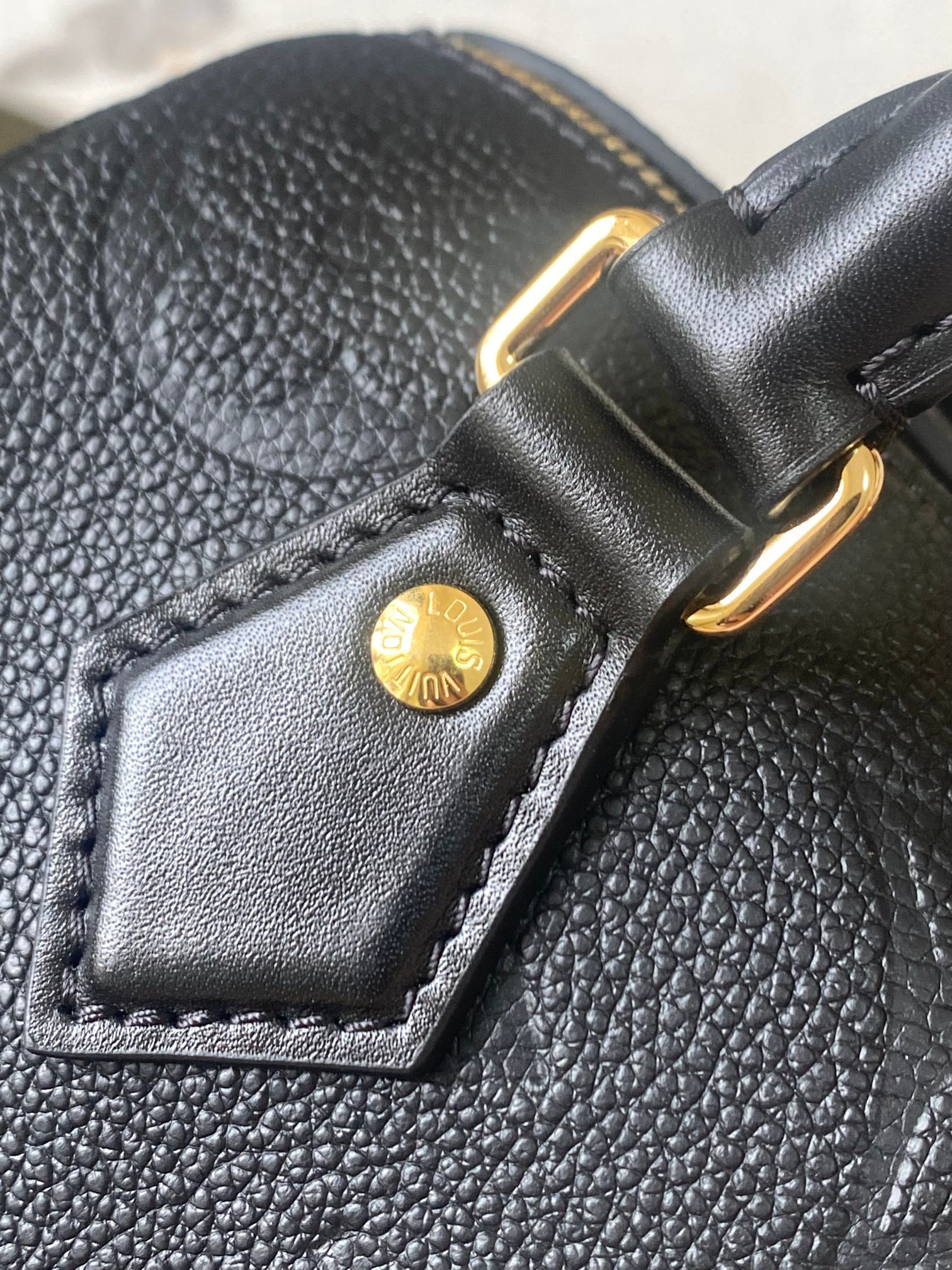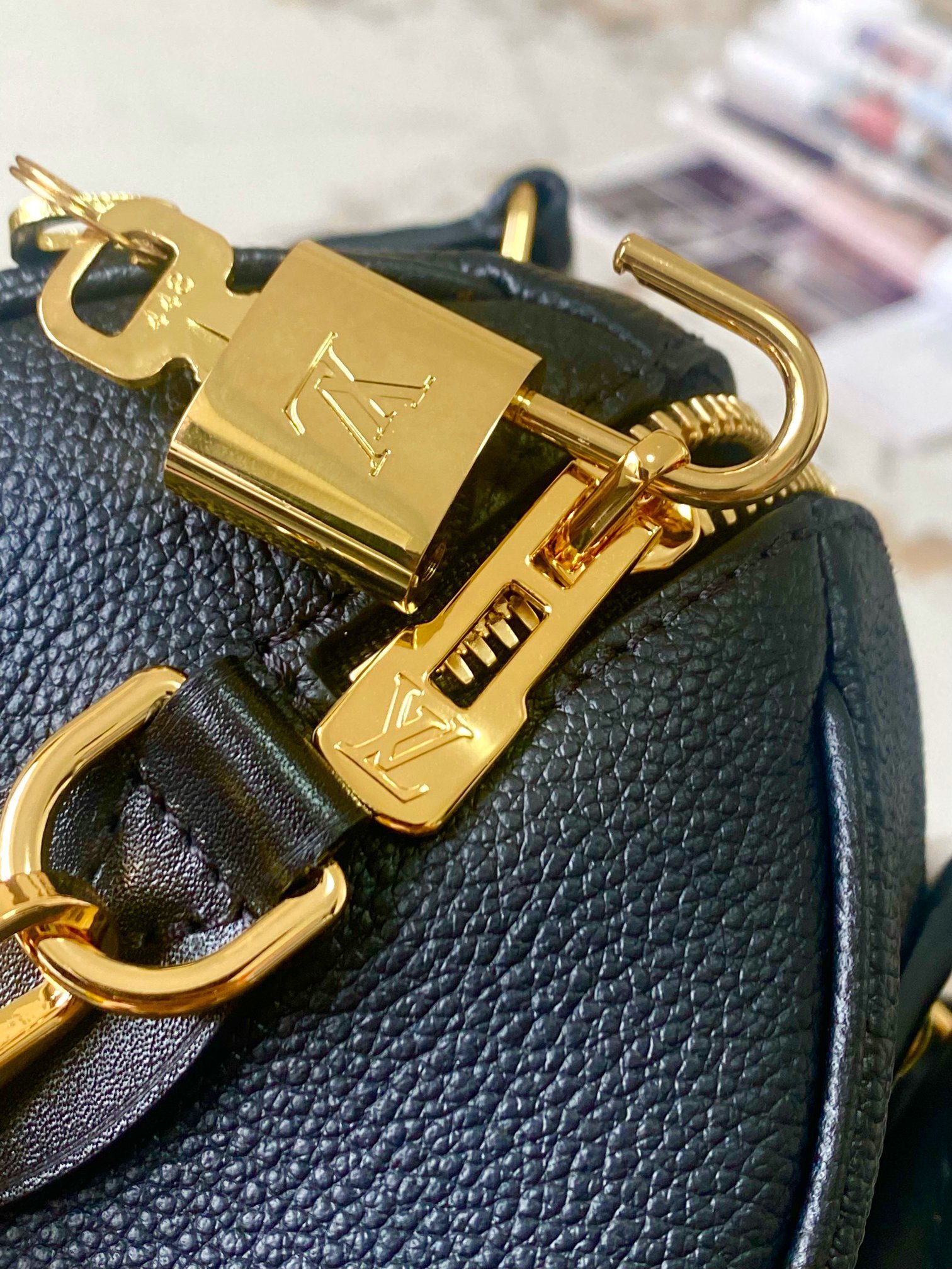 The Speedy Bandoulière 20 is an on-trend compact handbag, just the right size to carry daily essentials. It’s made from smooth grained Monogram Empreinte leather, embossed with an Oversized Monogram pattern. The hardware and padlock are a golden color. It has a delicate chain strap – removeable and adjustable – in addition to two Toron handles.