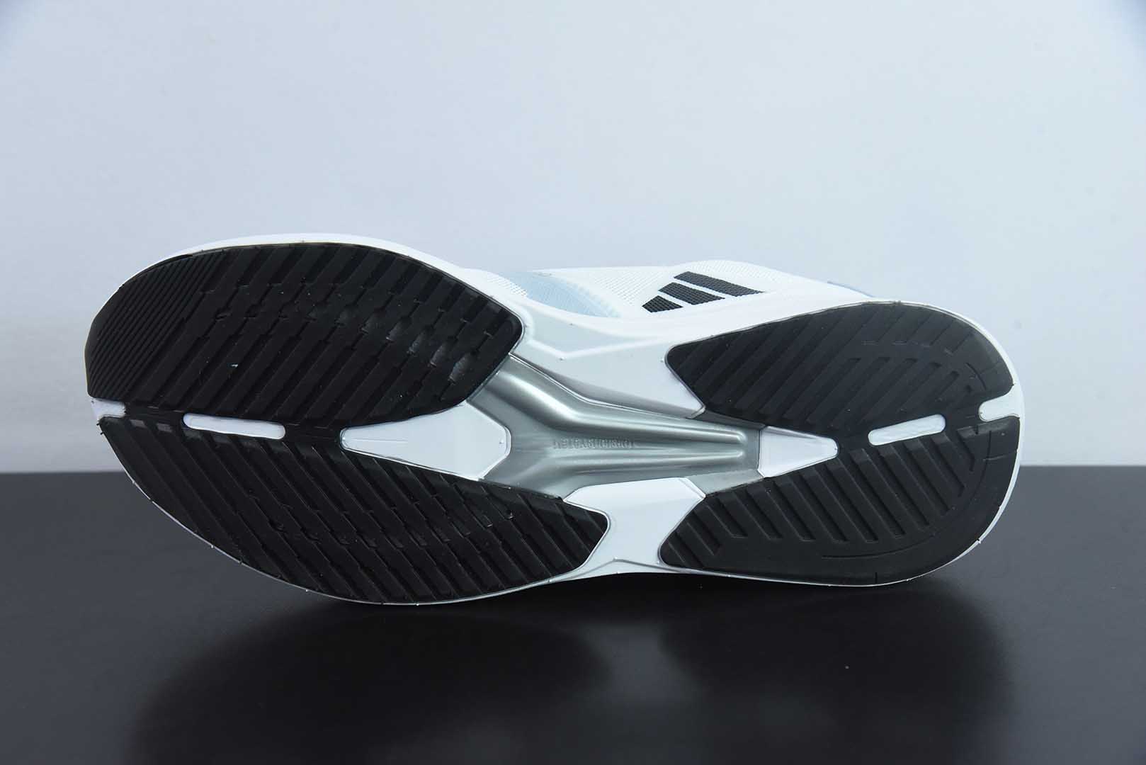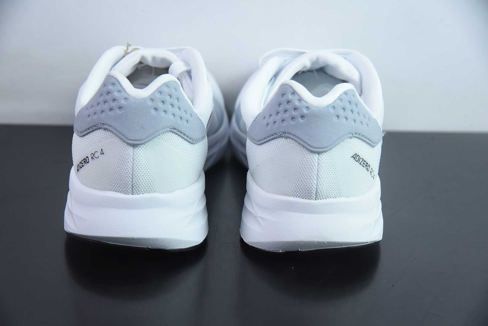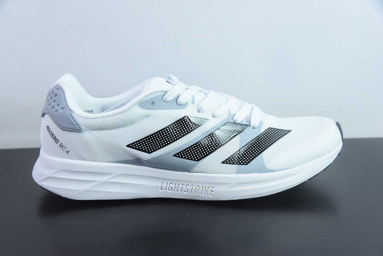 The adidas Adizero RC 4 running shoe anchors its design in the brand’s iconic Cloud White, accented by grounding Mineral Grey and sleek Core Black for an understated yet fashion-forward aesthetic. The signature three stripes feature an innovative dot-matrix texture that creates striking visual contrast against the pristine white backdrop.