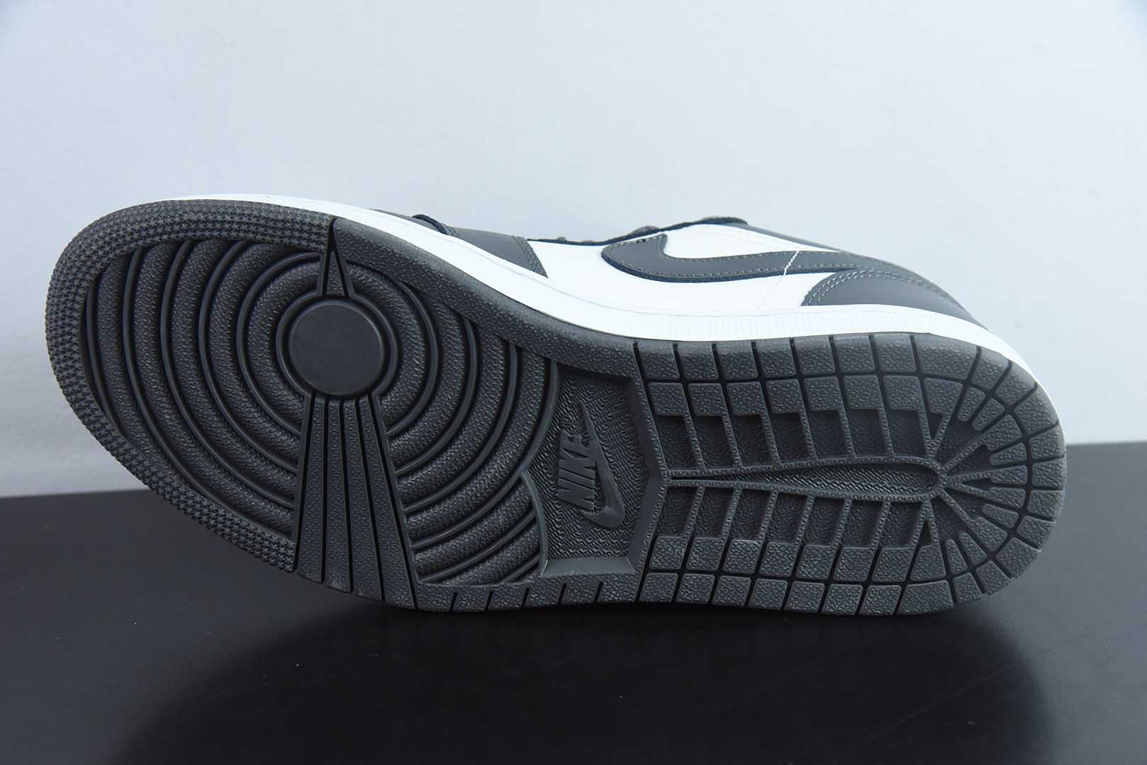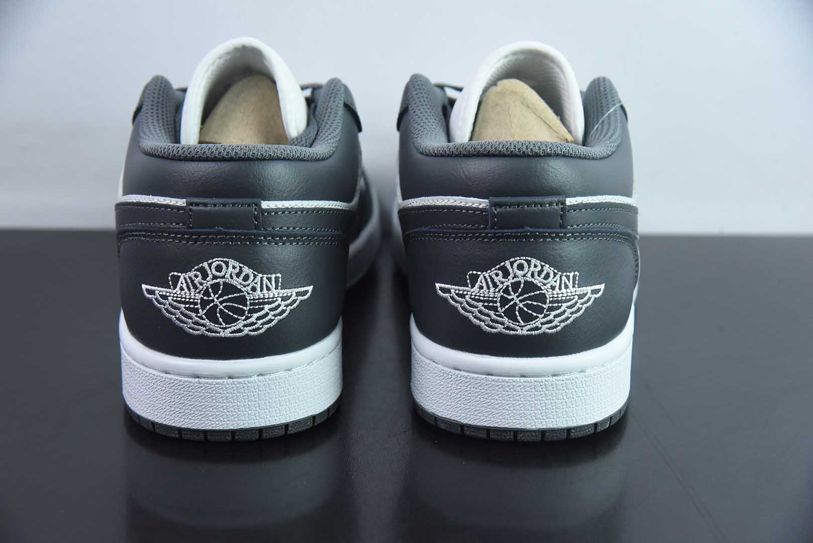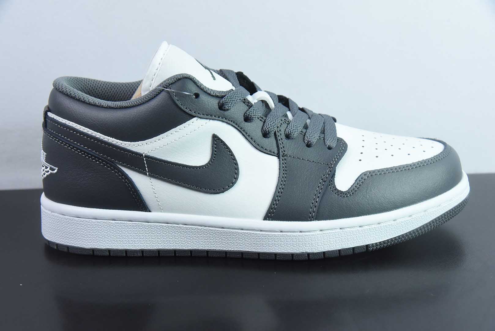 The Air Jordan 1 Low crafts its foundation in premium Light Smoke Grey and Sail leather, accented by a stark black Swoosh for iconic contrast. A grey suede toe box introduces textured depth against the smooth white upper, while the black Wings logo on the heel delivers the definitive finishing touch.