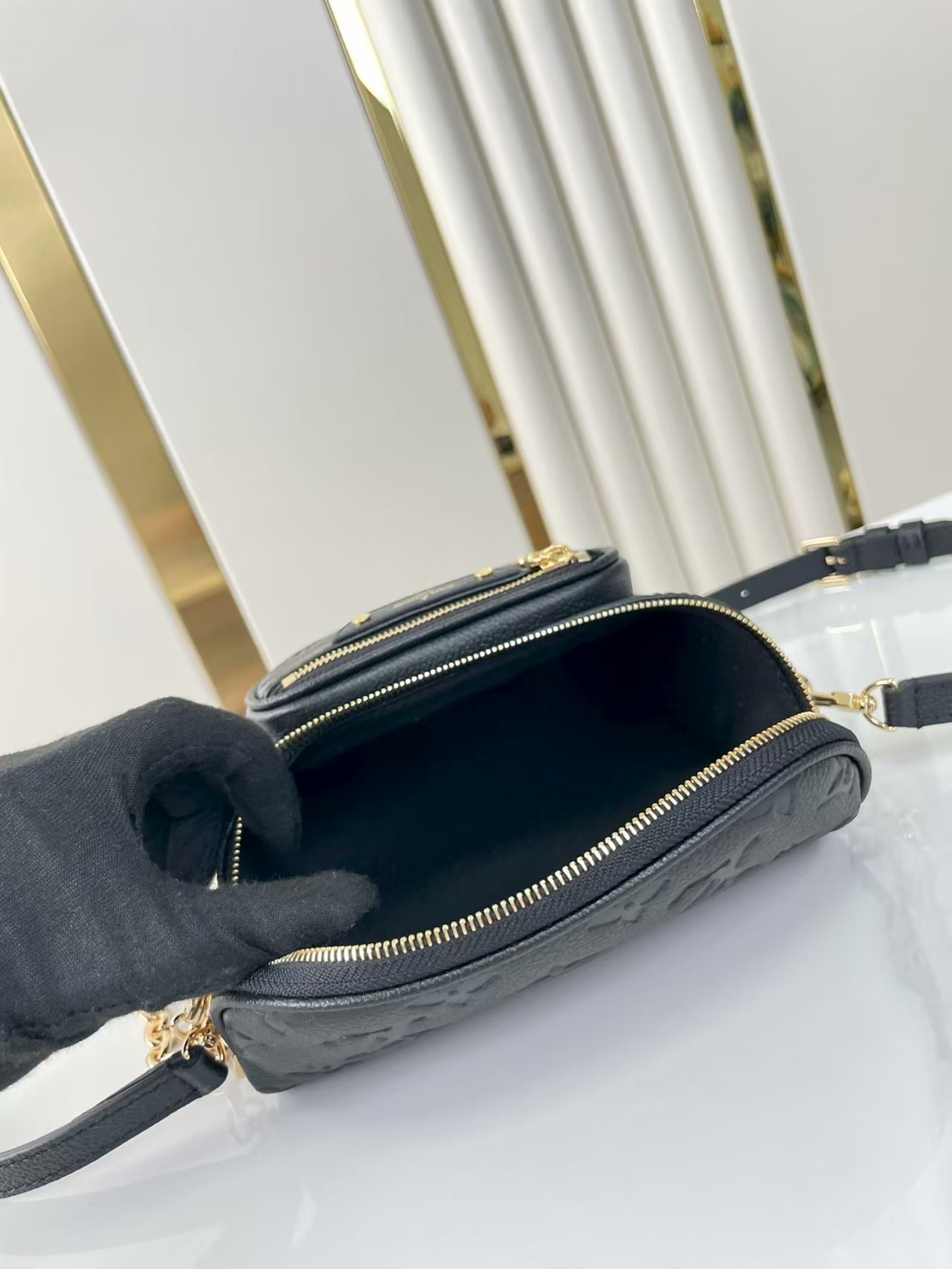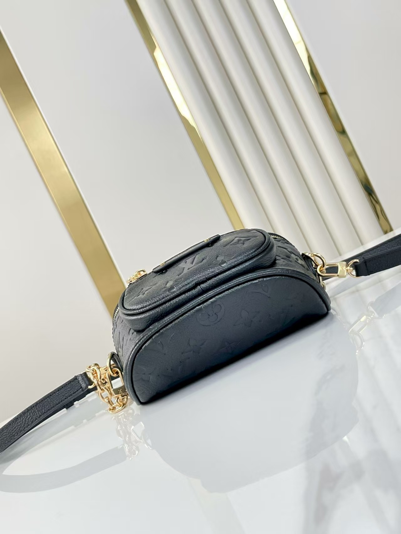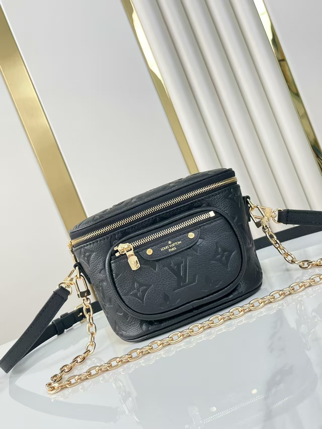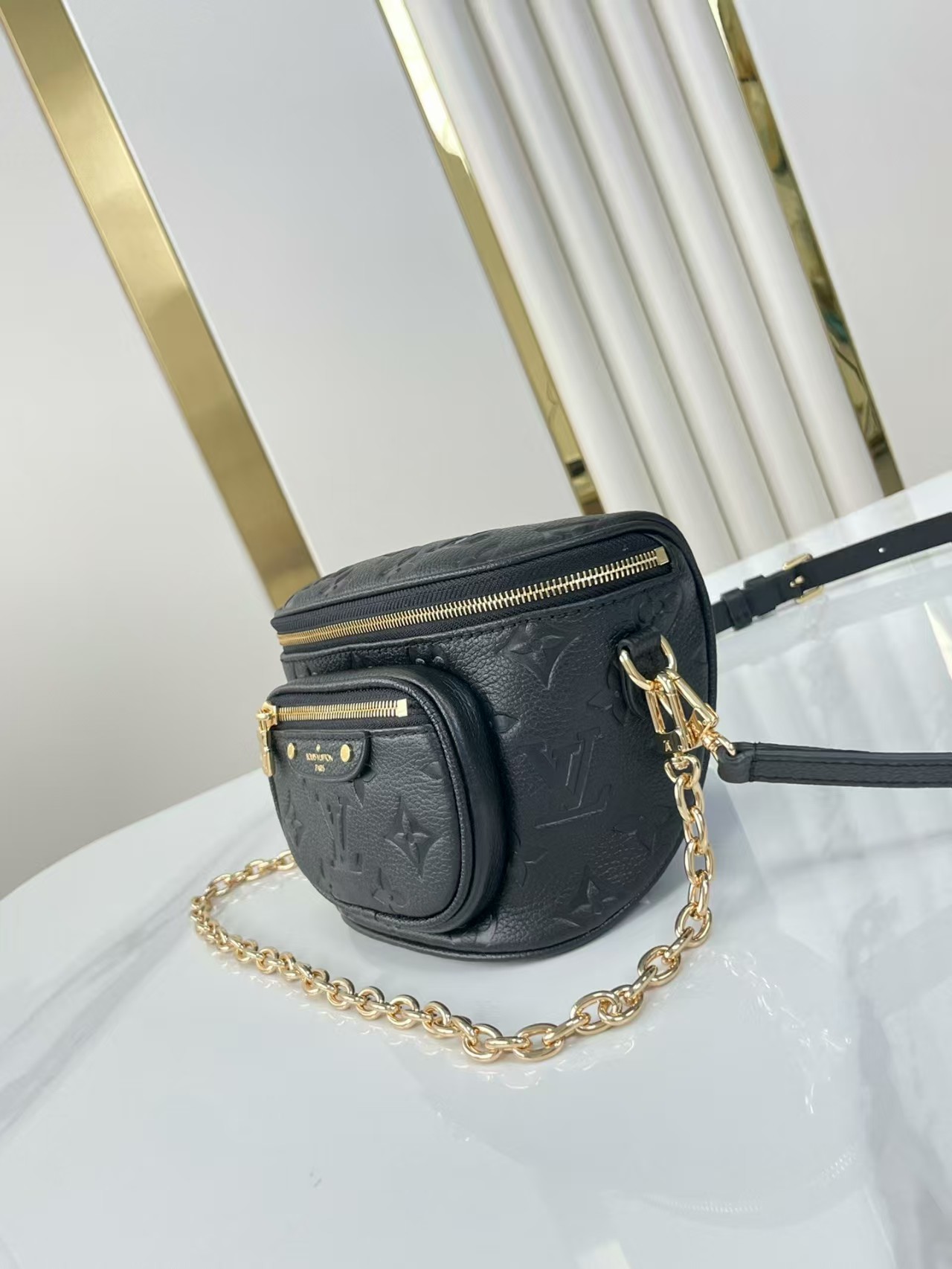The Mini Bumbag is reinterpreted in supple, grained Monogram Empreinte leather, which is embossed with the Monogram pattern. This on-trend piece features a removable, adjustable strap and a removable, gold-tone chain for different looks and carry options. It has a zipped main compartment and a zipped front pocket with an embossed leather tag.